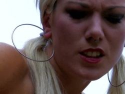 Attraktive Blonde mit Körperverzierungen lutscht Schwänze