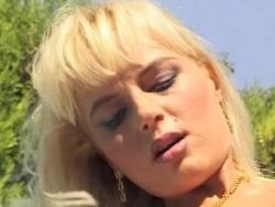 Blondierte Frau lässt sich von potenten Typen die glatte Votze poppen