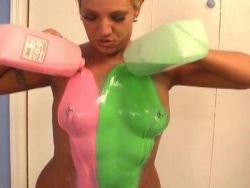 Die prallen Brüste und die rasierte Fotze werden mit rötlichen Getränken eingesaut