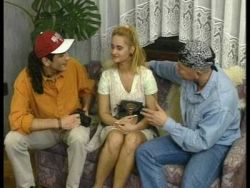 Deutsche blonde Frau lutscht den Riemen und schluckt alles