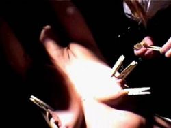 Die gnadenlose Bitch befestigt mehrere Klammern an den prallen Glocken der gehorsamen Gespielin