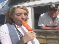 Hübsche verkommene Schlampe lutscht einen Schwanz