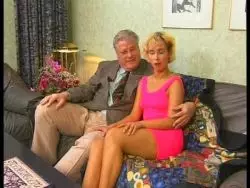 Eine unrasierte blonde Frau auf dem Sofa im Doppel gevögelt