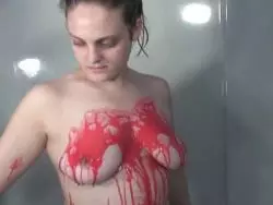 Die prallen Brüste und die rasierte Fotze werden mit rötlichen Getränken eingesaut